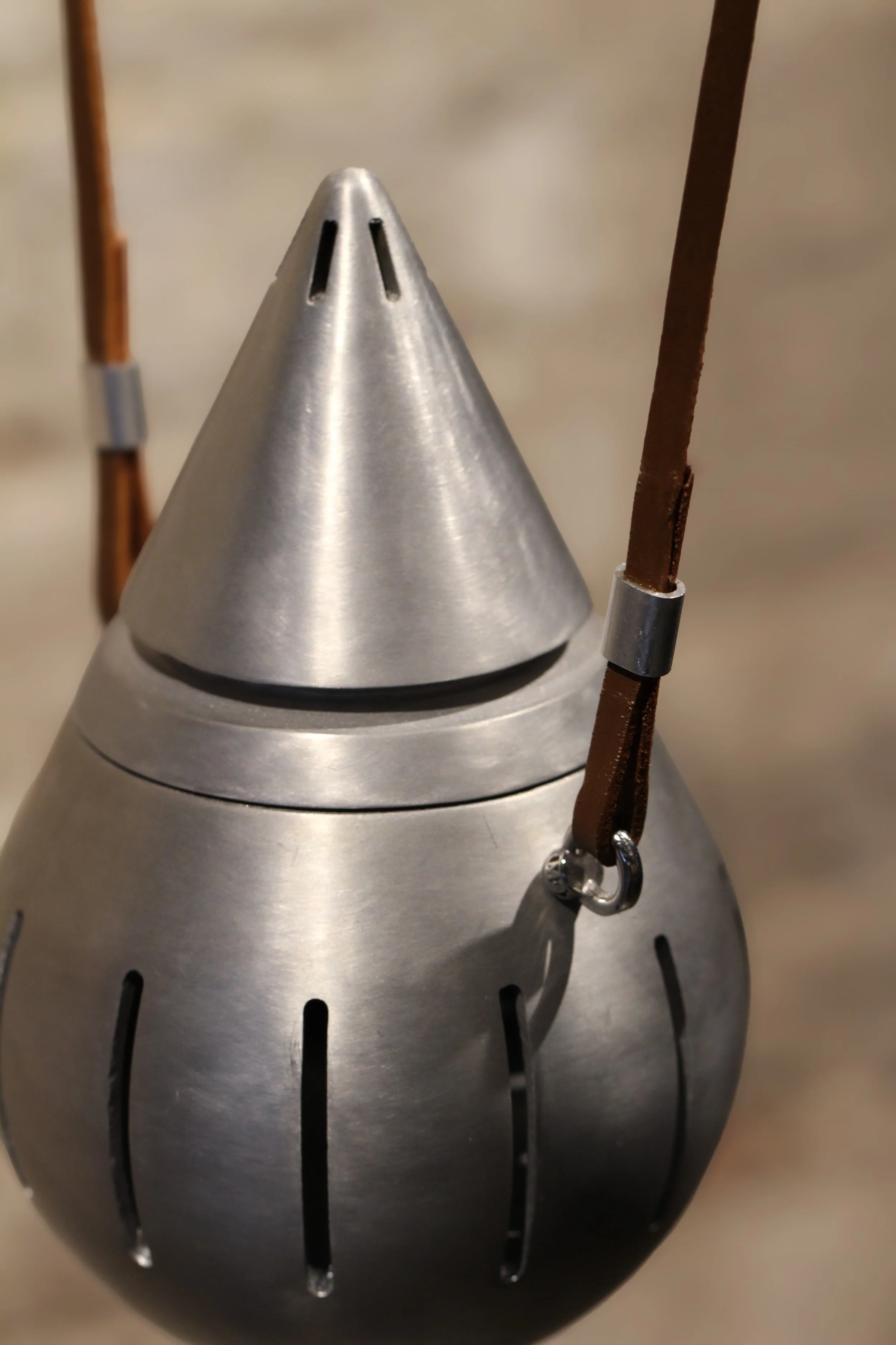 Mood Swing features three different incense burners. One is sintered in aluminium and suspended from the ceiling via a set of leather straps, which allows it to swing through the air. The remaining two are stoneware ceramics and move through different methods. The first is mounted on a steel stand, which allows the incense burner to rock back and forth, while the second is freestanding, intended to roll and tilt, but never fall over thanks to the weight in the bottom.